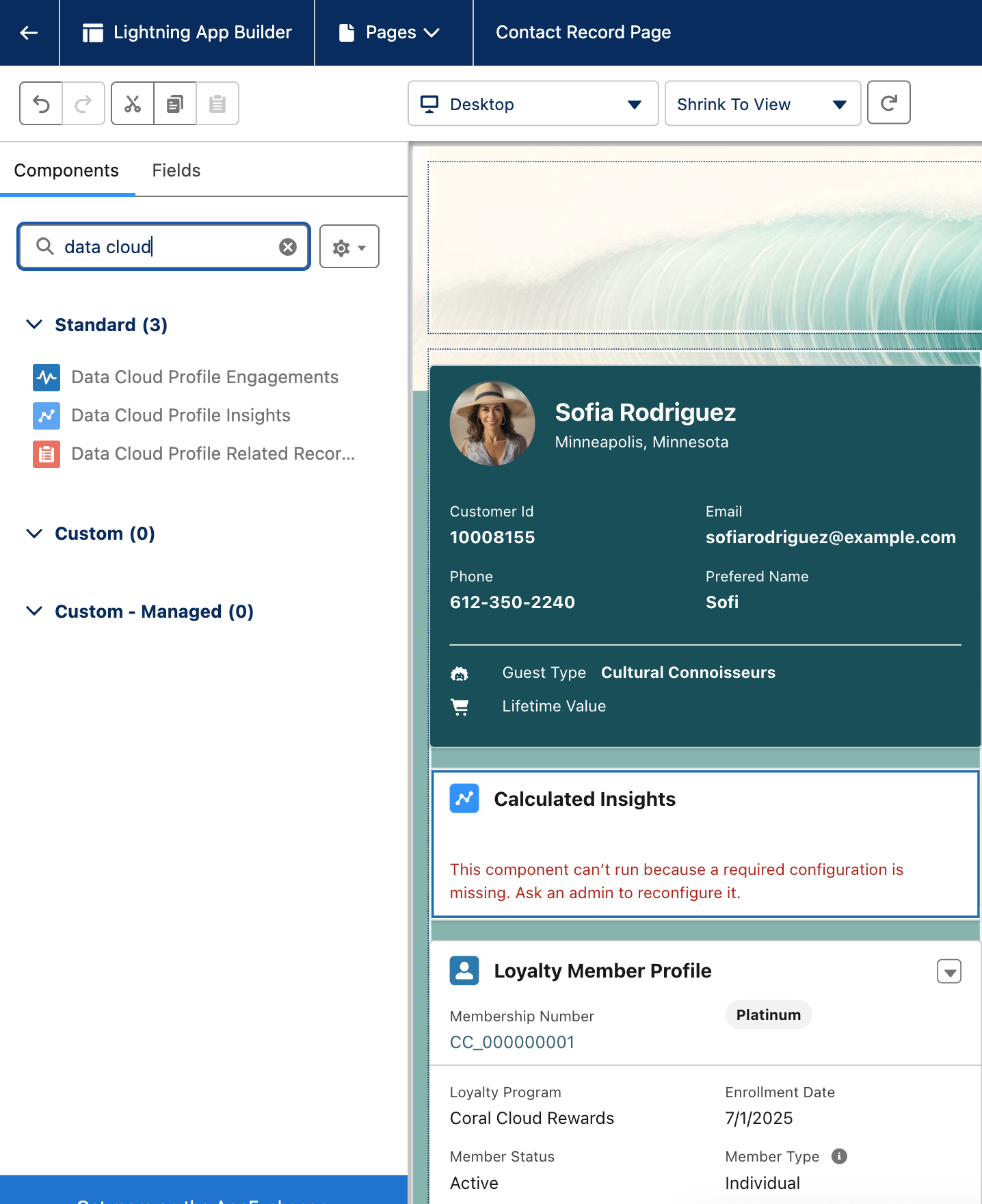 In the left-side panel drag Data Cloud Profile Insights over to the right and place it between the Contact Card and the Loyalty Member Profile component.